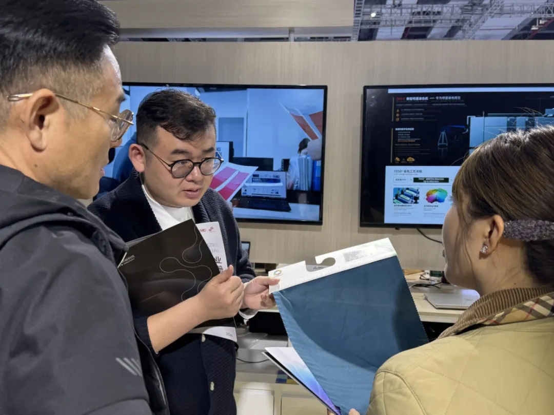 在展位现场,环峪科技重点展示了 TDSD® DH系列喷墨染色设备和 TDSD®三位一体的解决方案 在纺织染整领域的应用成果。该技术通过数字喷墨系统实现纺织品的精准上色控制与均匀着色,在保证色彩稳定性与品质的同时,有效提升生产效率,并减少生产过程中的资源消耗。